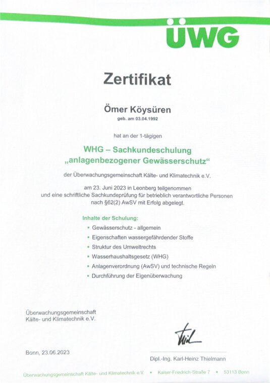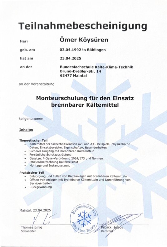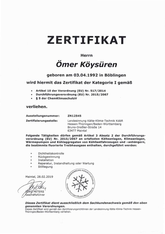 Der handwerksrechtliche Betriebsleiter für das Kälteanlagenbauer-Handwerk ist Ömer Köysüren.