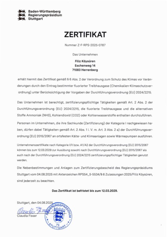 Unser Unternehmen verfügt über die offizielle betriebliche Kältezertifizierung des Regierungspräsidiums Stuttgart. Damit sind wir als Fachbetrieb anerkannt und berechtigt, alle gesetzlich vorgeschriebenen Arbeiten an Kälte-, Klima- und Wärmepumpenanlagen durchzuführen.