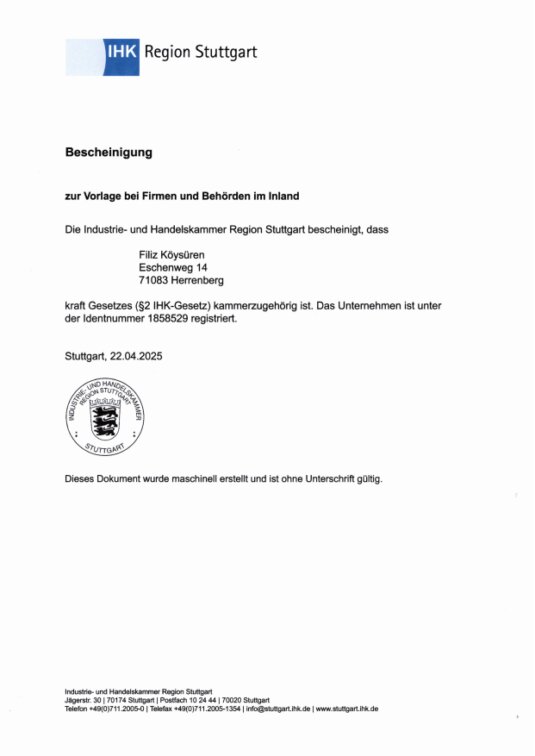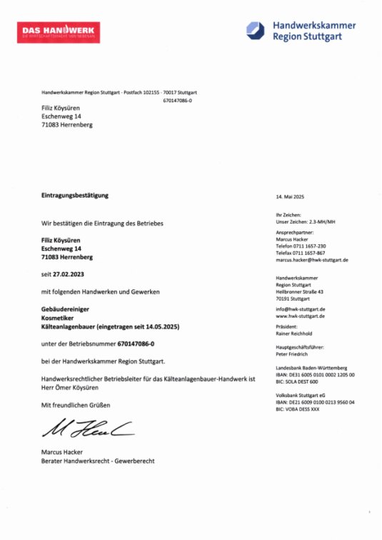 Damit ist sichergestellt, dass unsere Leistungen auf einer soliden rechtlichen und fachlichen Grundlage erbracht werden und Kunden auf die Qualität und Seriosität unseres Betriebs vertrauen können.