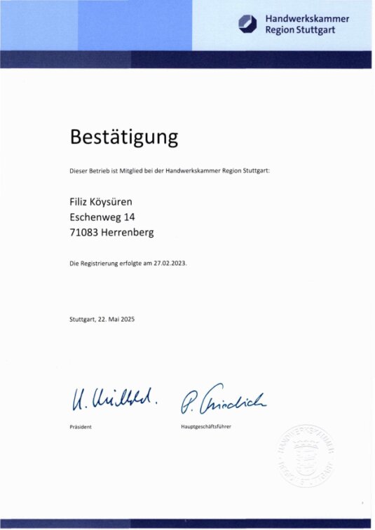 Unser Betrieb ist seit dem 27.02.2023 offiziell in die Handwerksrolle der Handwerkskammer Stuttgart eingetragen.